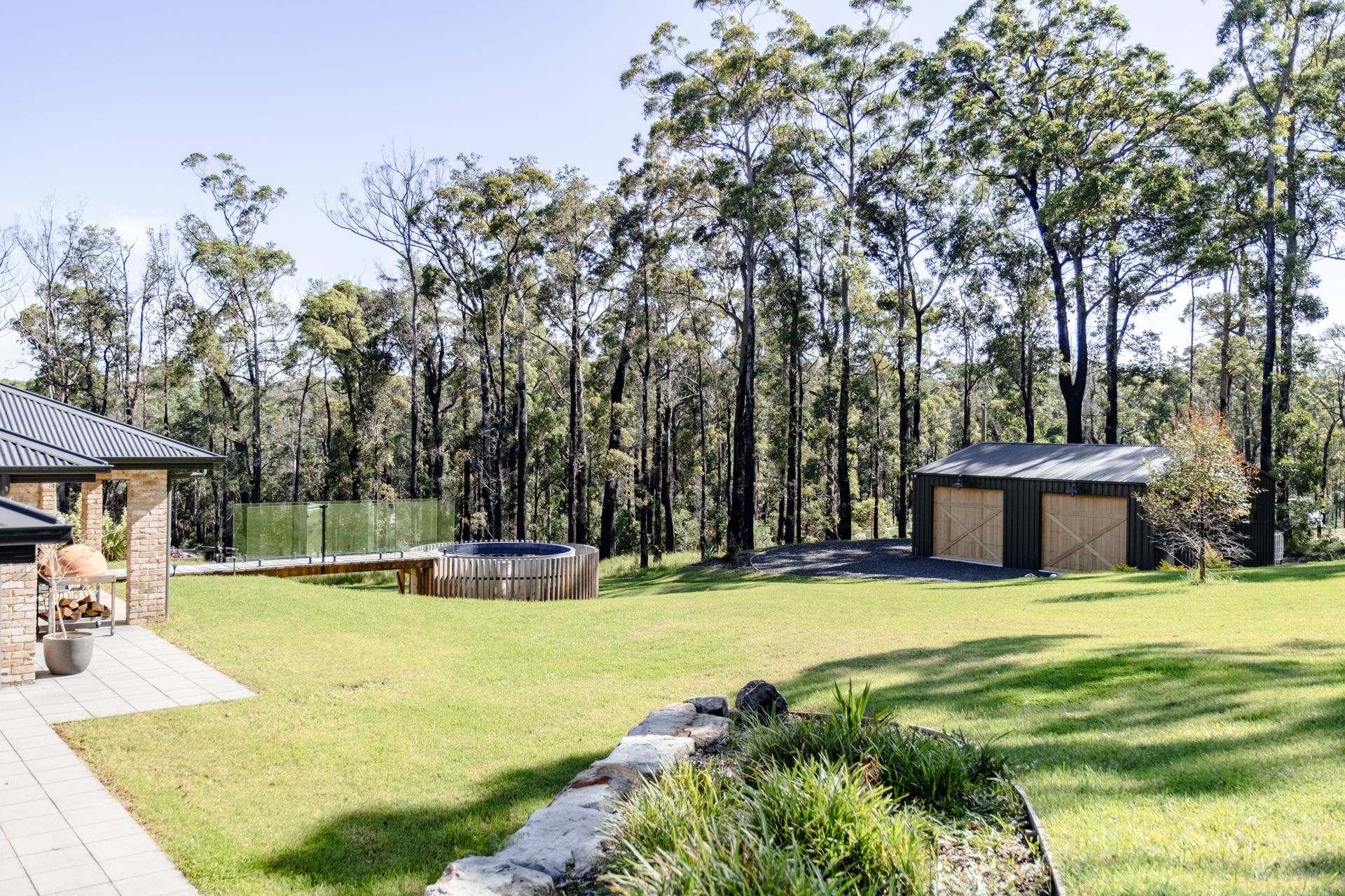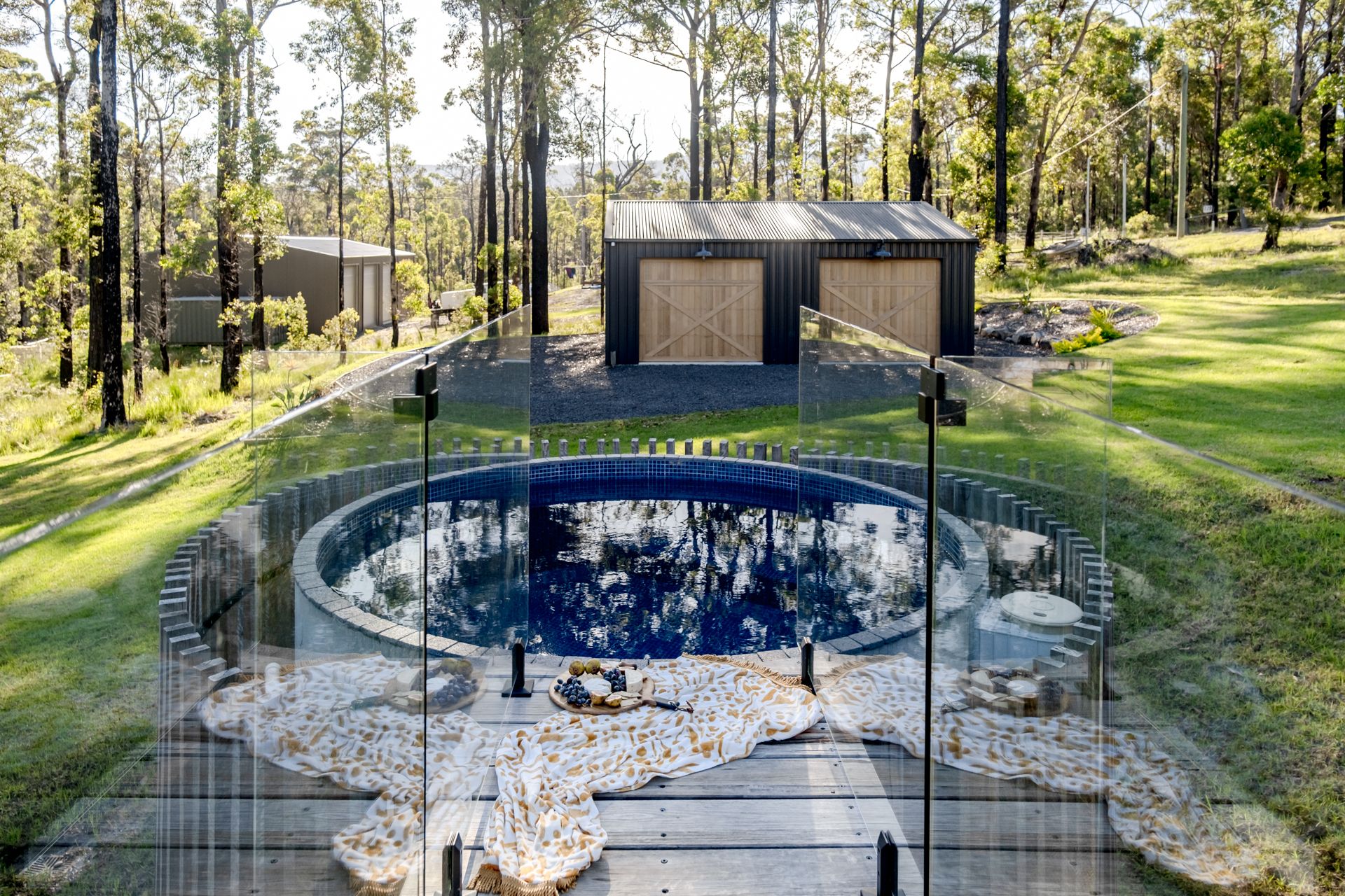 Immerse yourself in the allure of a private pool, surrounded by lush green grass, offering a tranquil view of towering trees. It's your personal haven, where relaxation takes center stage.