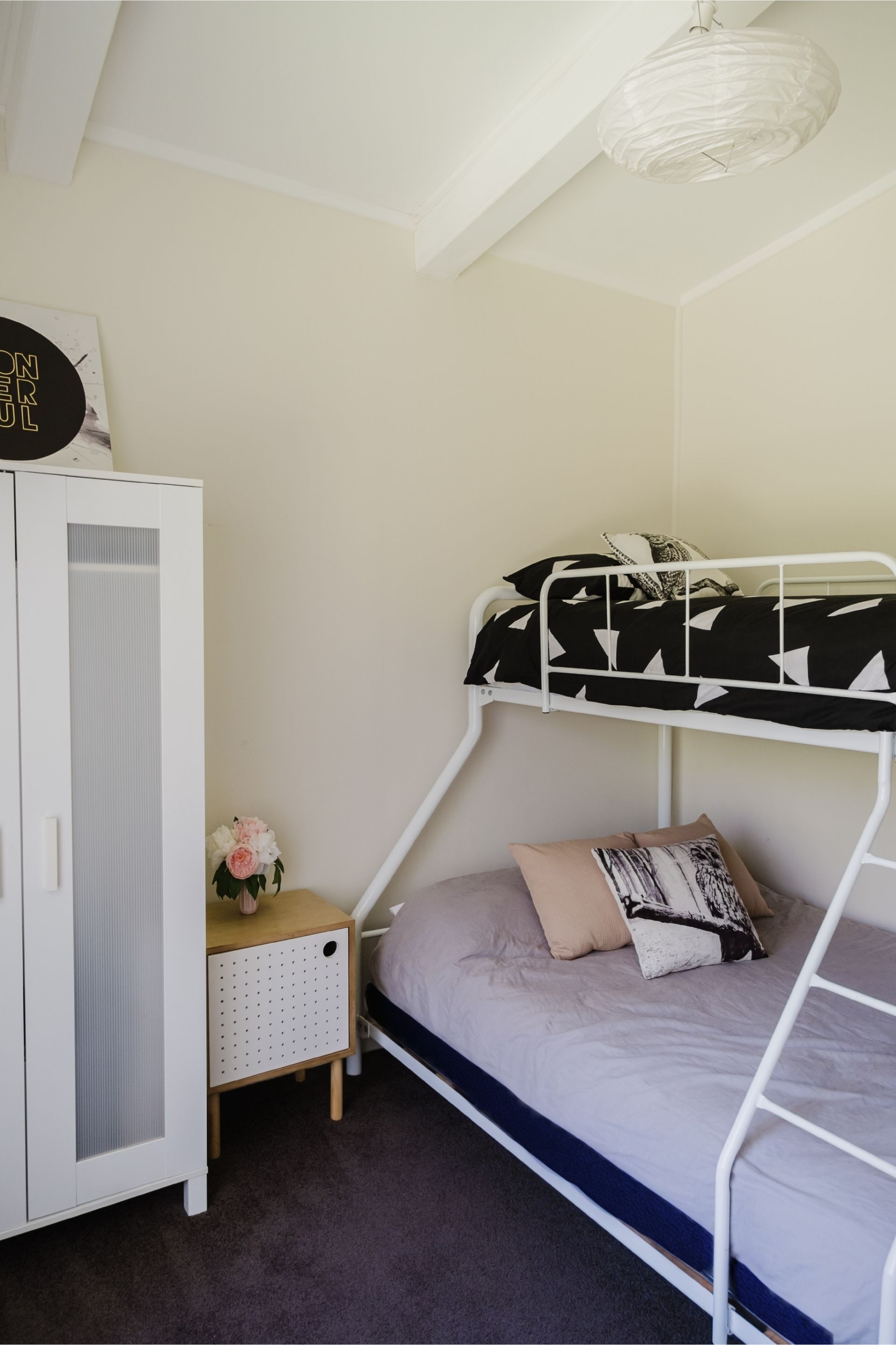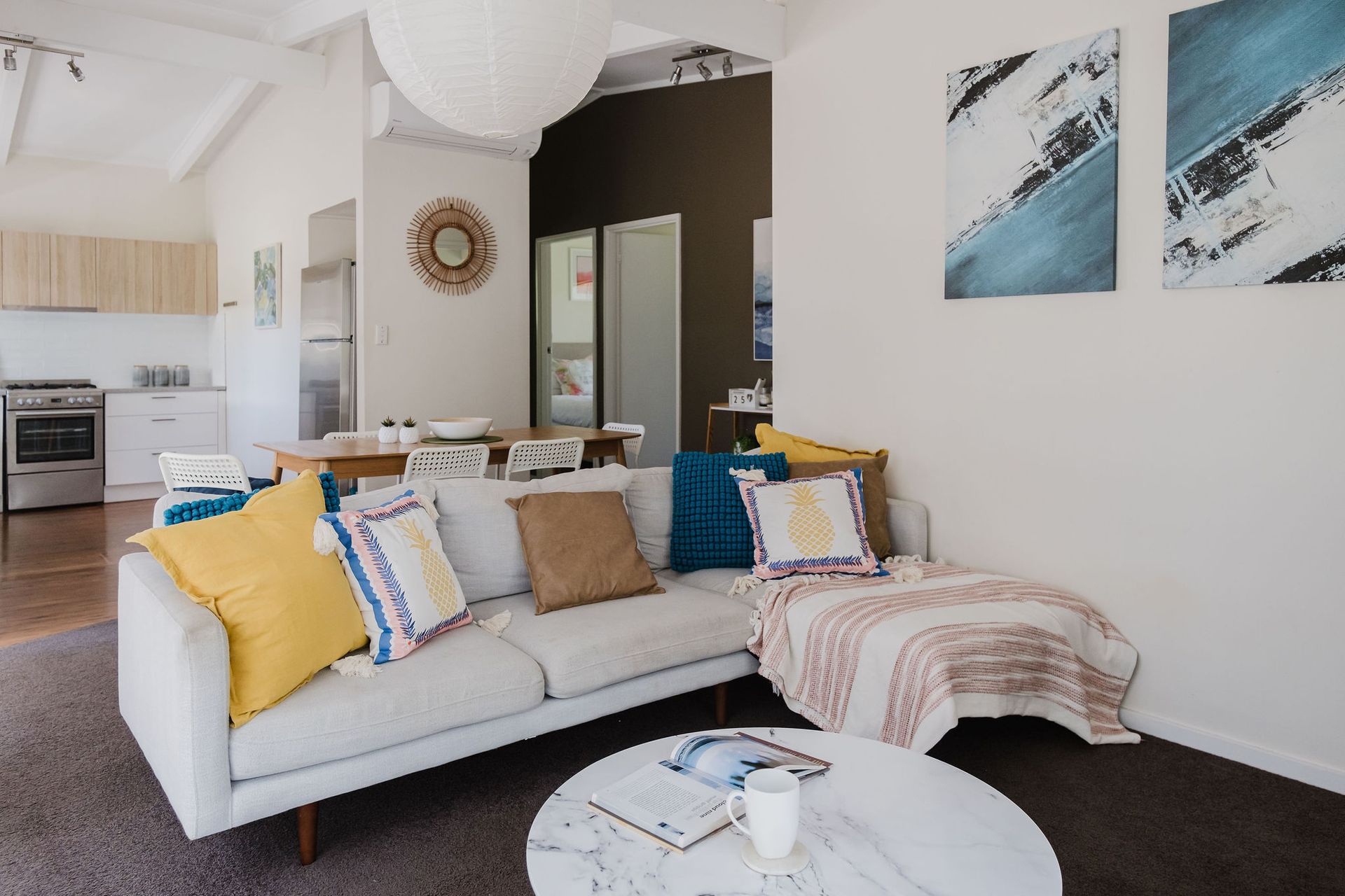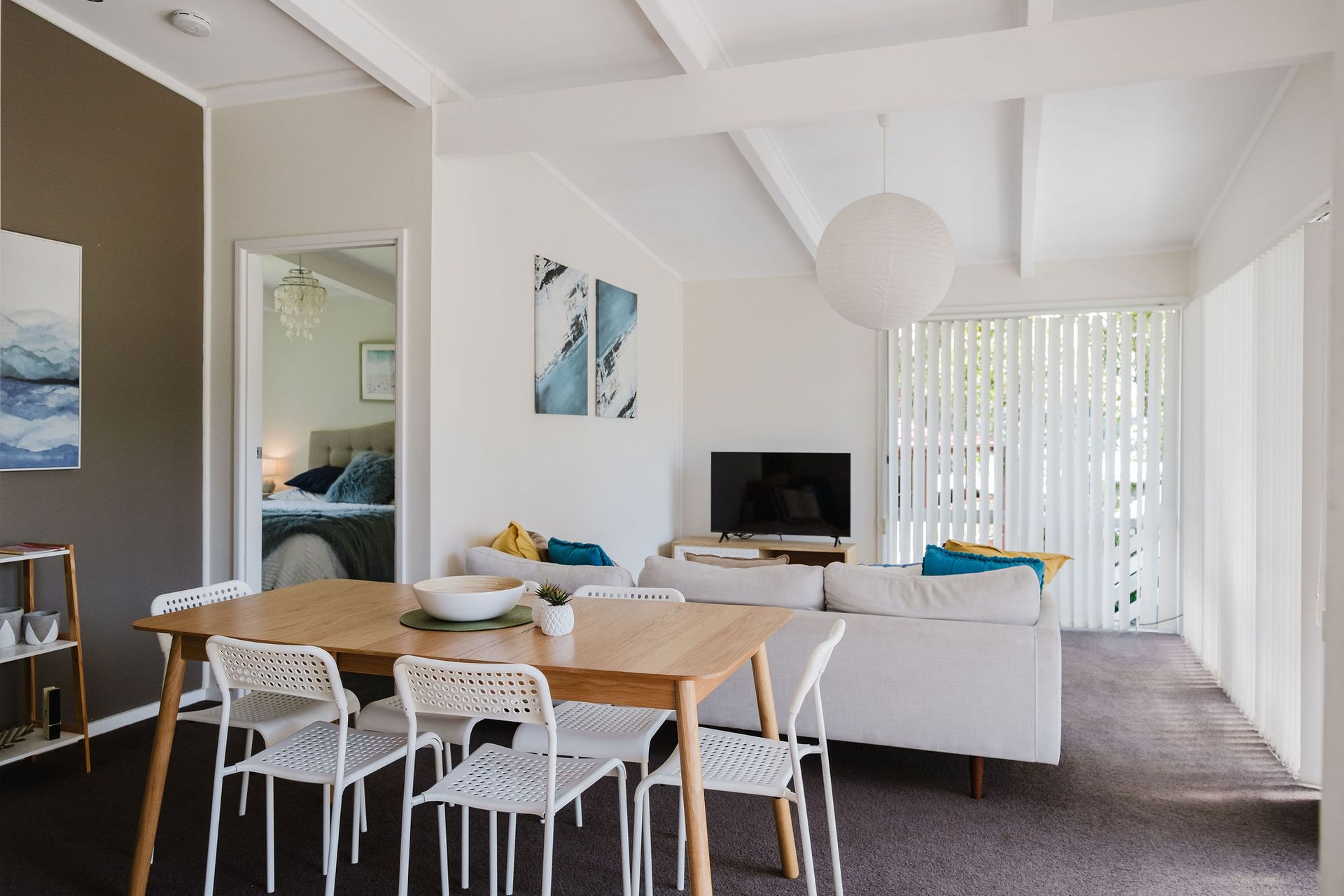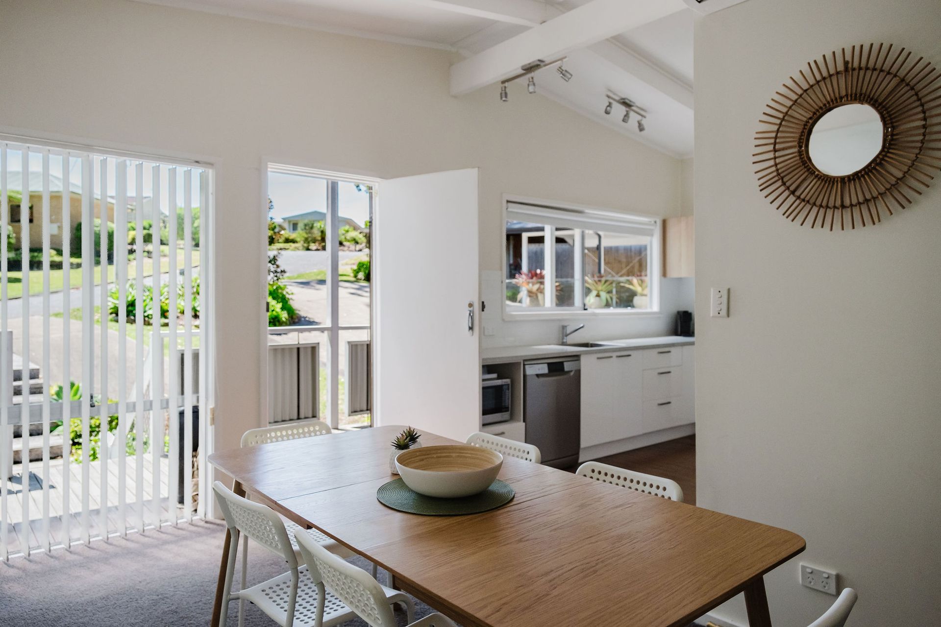 Light-filled interiors create a fresh, modern feel, complemented by thoughtful touches that make every stay effortless. The open-plan living, dining and kitchen area forms the heart of the home, providing a welcoming space to gather after a day by the sea. The main bathroom has been recently renovated, and three generous bedrooms offer restful spaces for up to seven guests. The master bedroom features a king bed, the second a queen, and the third a tri-bunk.