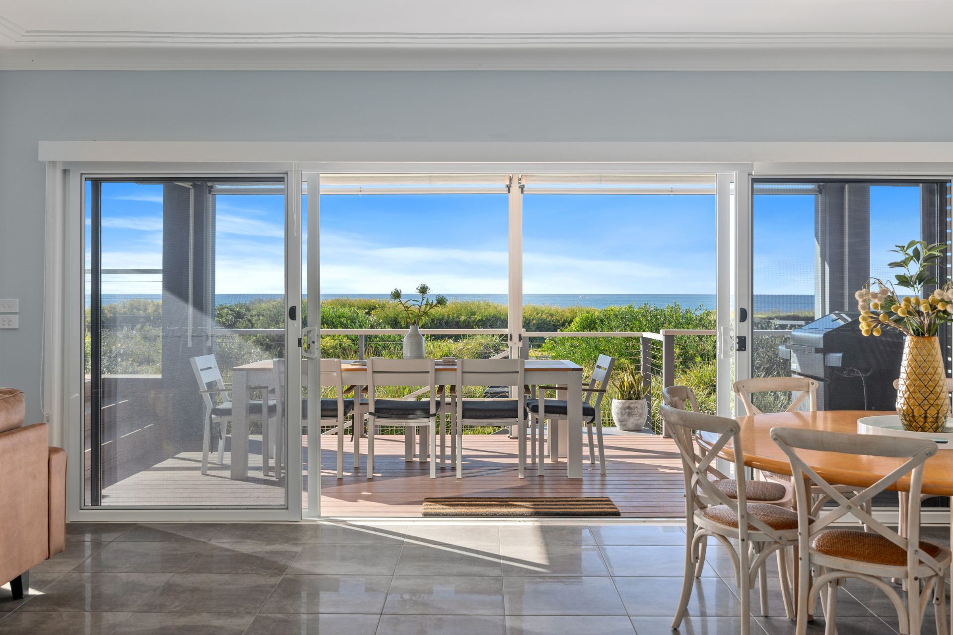 Indulge in the serene rhythm of crashing waves and the invigorating sea breeze from your spacious retreat. Ideal for families or two family groups seeking tranquility, this home features expansive indoor and outdoor living areas. The open plan design seamlessly connects the living, dining, and kitchen spaces to a sunlit deck complete with outdoor furnishings and a barbecue overlooking the ocean. A second kitchen and living area at the opposite end of the house provide additional convenience and privacy.