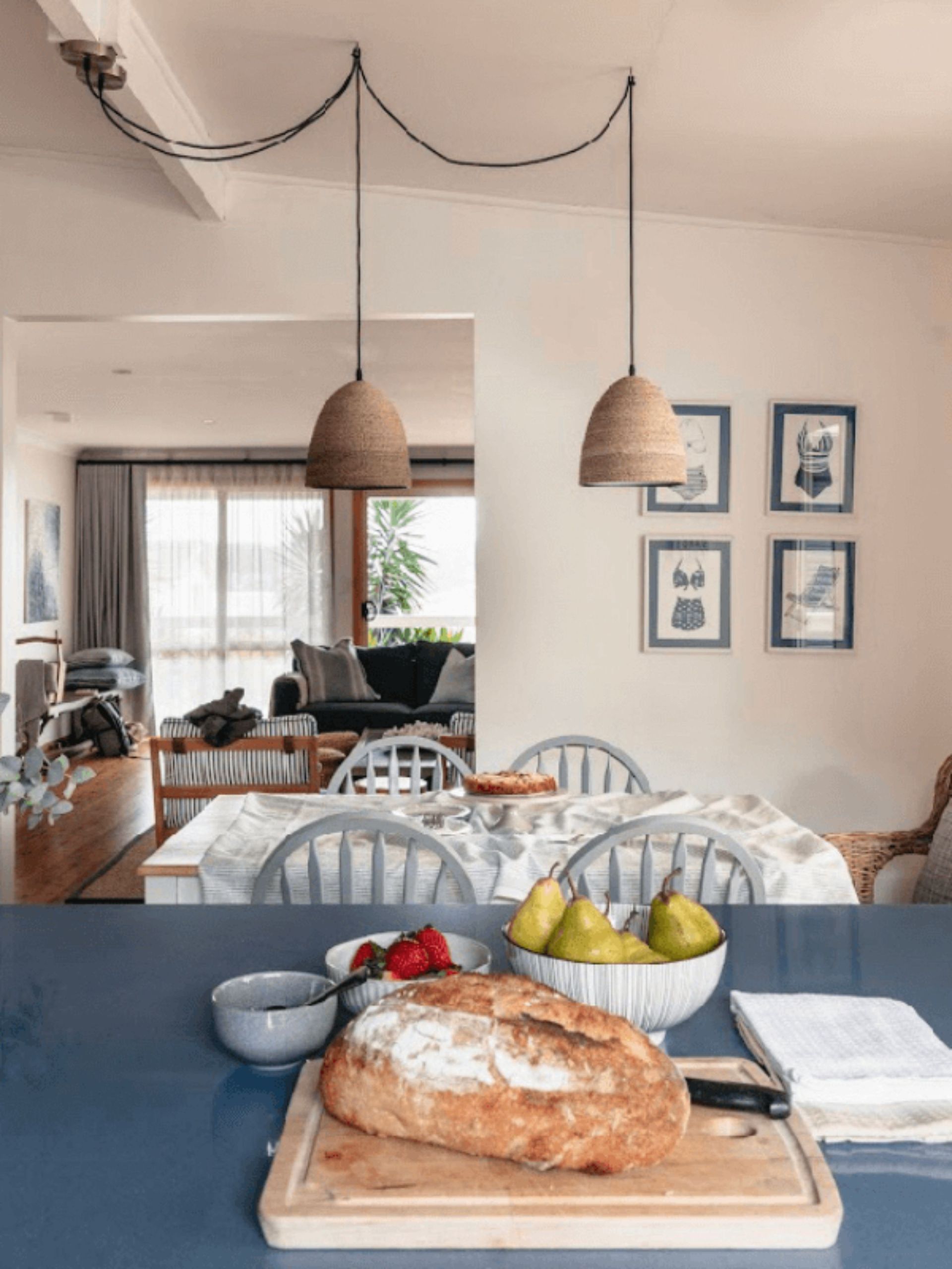 The home features two living areas across its split-level layout, designed for both relaxation and entertaining. Upstairs, a large open-plan lounge and dining area with sweeping coastal views flows onto a generous deck, offering both covered and open areas so you can enjoy the sun or shade while watching the waves roll in. This level also includes a queen bedroom and a bathroom. Downstairs, a fully equipped Caesarstone kitchen serves the second dining and lounge area, complete with a charming fireplace for cooler evenings. This space opens onto a north-facing deck, perfect for enjoying the morning sun over breakfast. Three additional bedrooms are located on this level: two queen bedrooms and a twin room, alongside a separate bathroom, ensuring comfort for all guests.