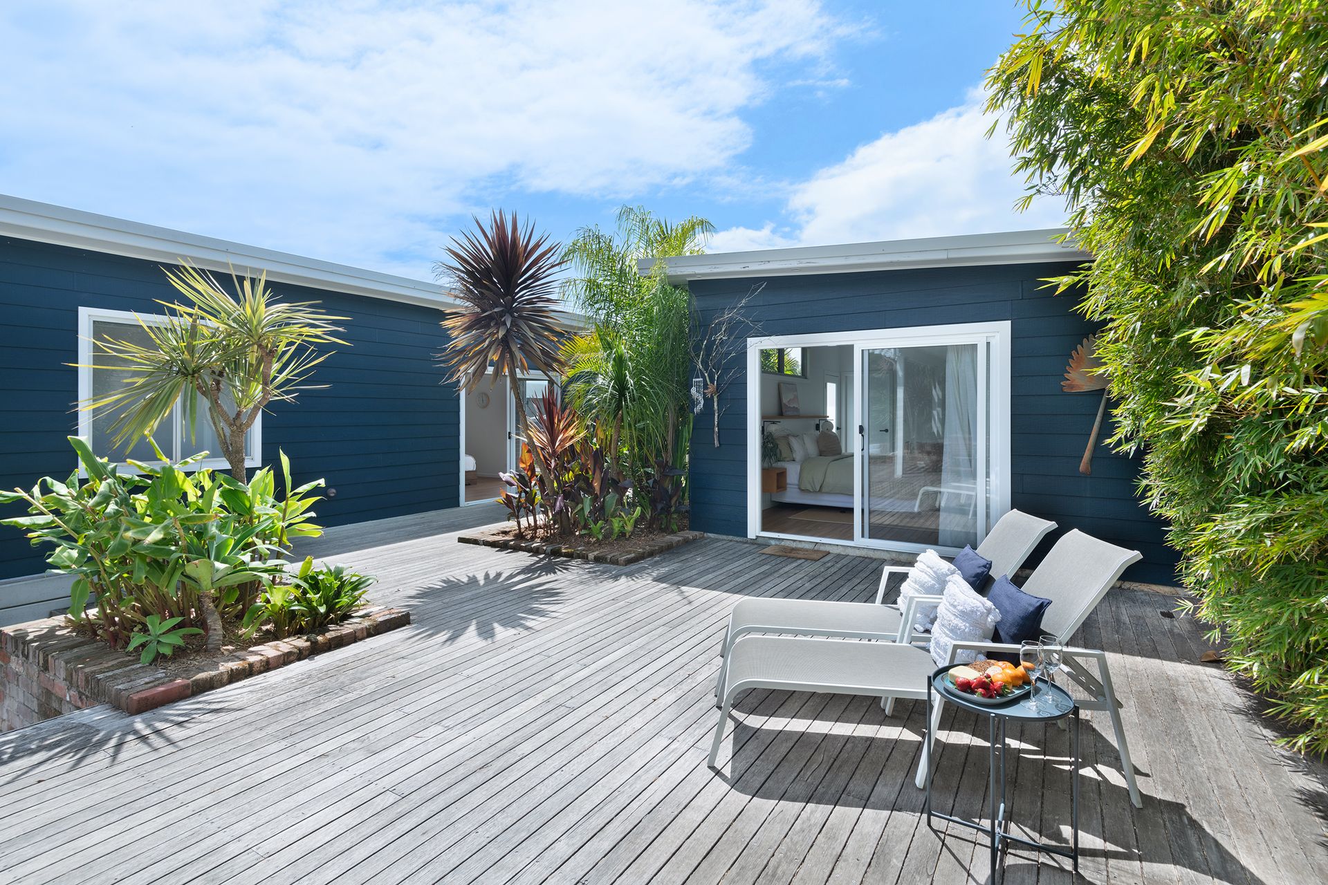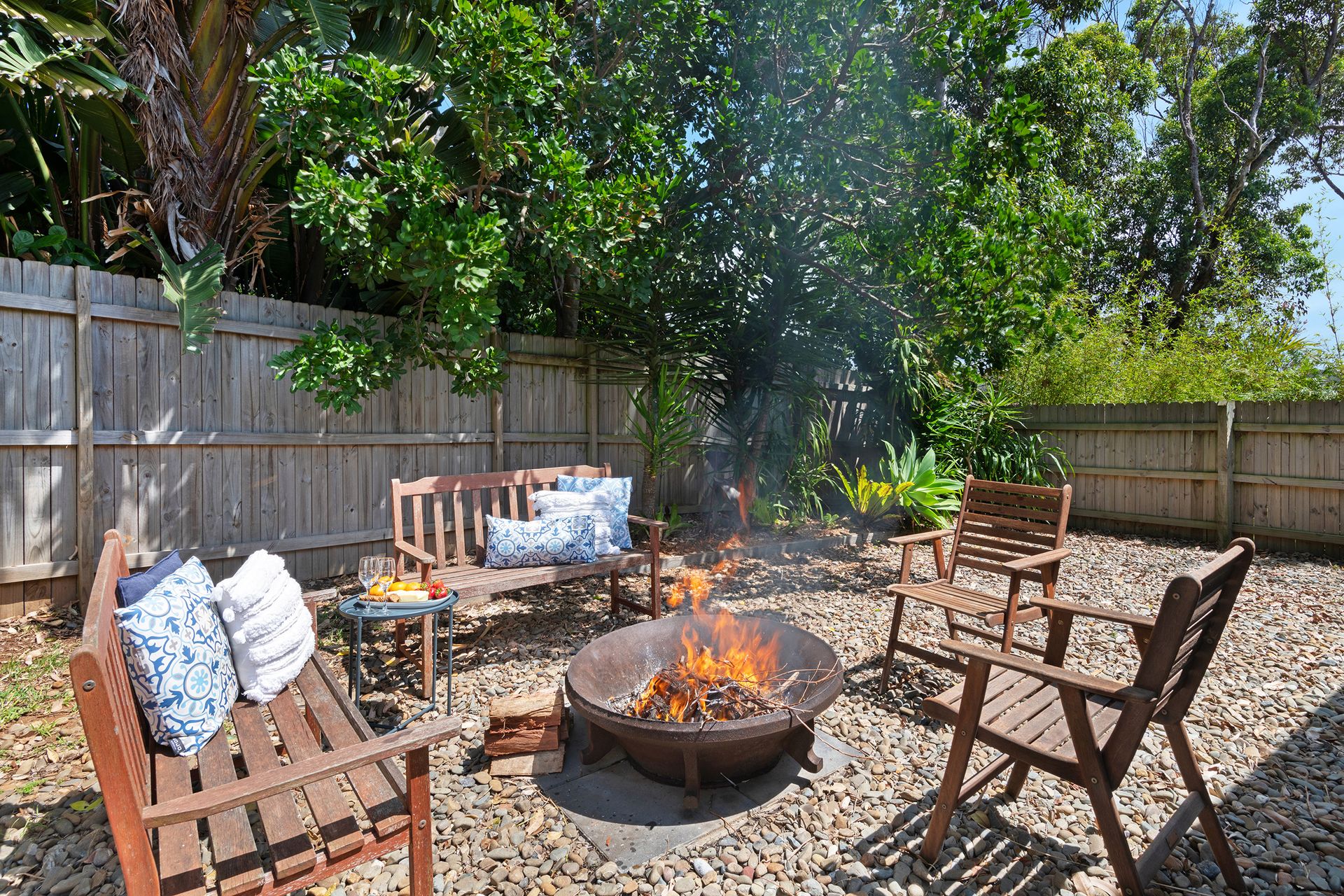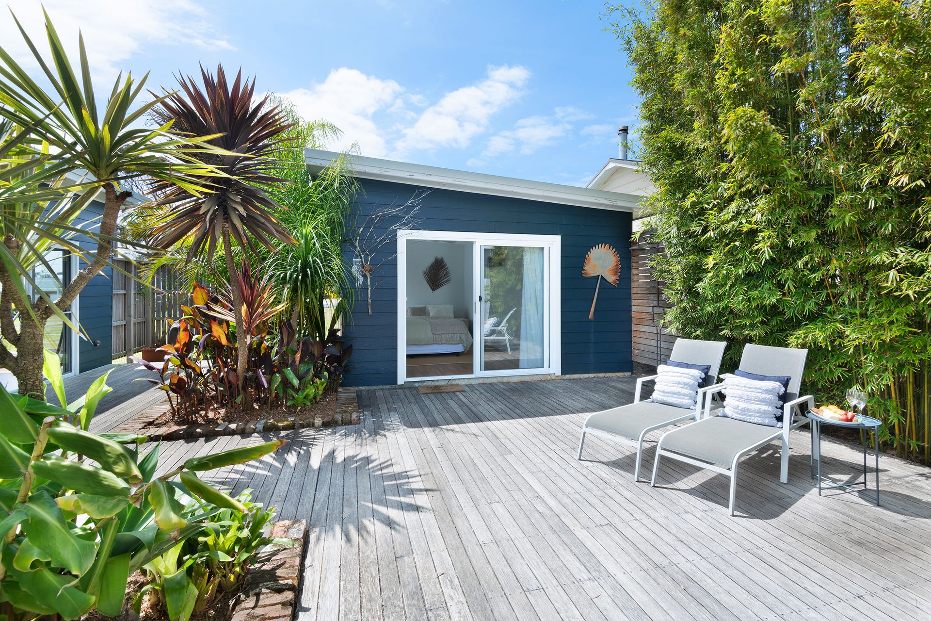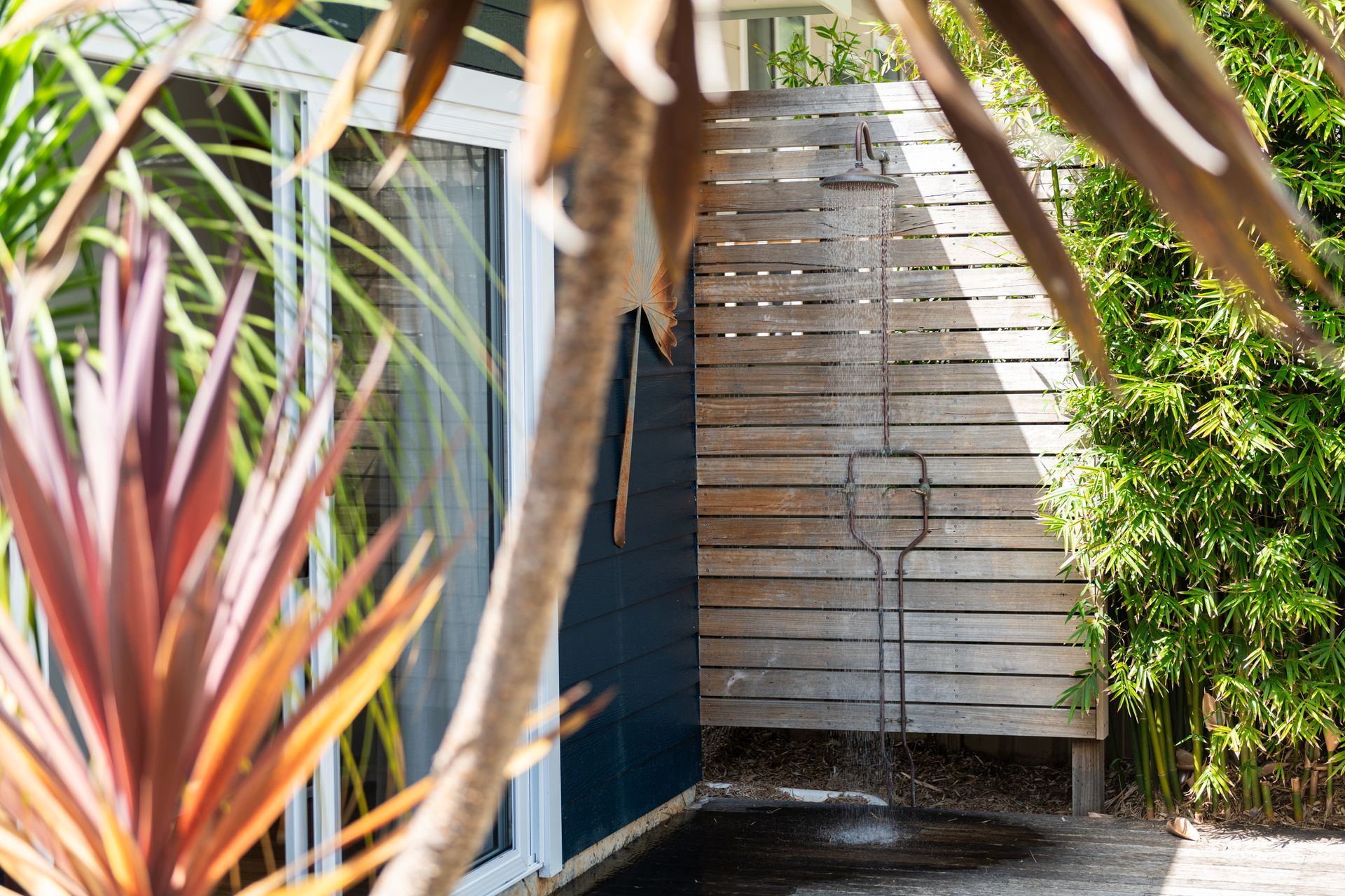 After a morning dip or a surf, rinse off in the private hot and cold outdoor shower before settling in for the afternoon on the generous timber deck. Surrounded by bamboo and established greenery, the garden evokes the feeling of a secluded tropical oasis. Share leisurely BBQ lunches, sip your coffee in the morning sunshine, or gather around the fire pit in the evening to toast marshmallows under the stars.