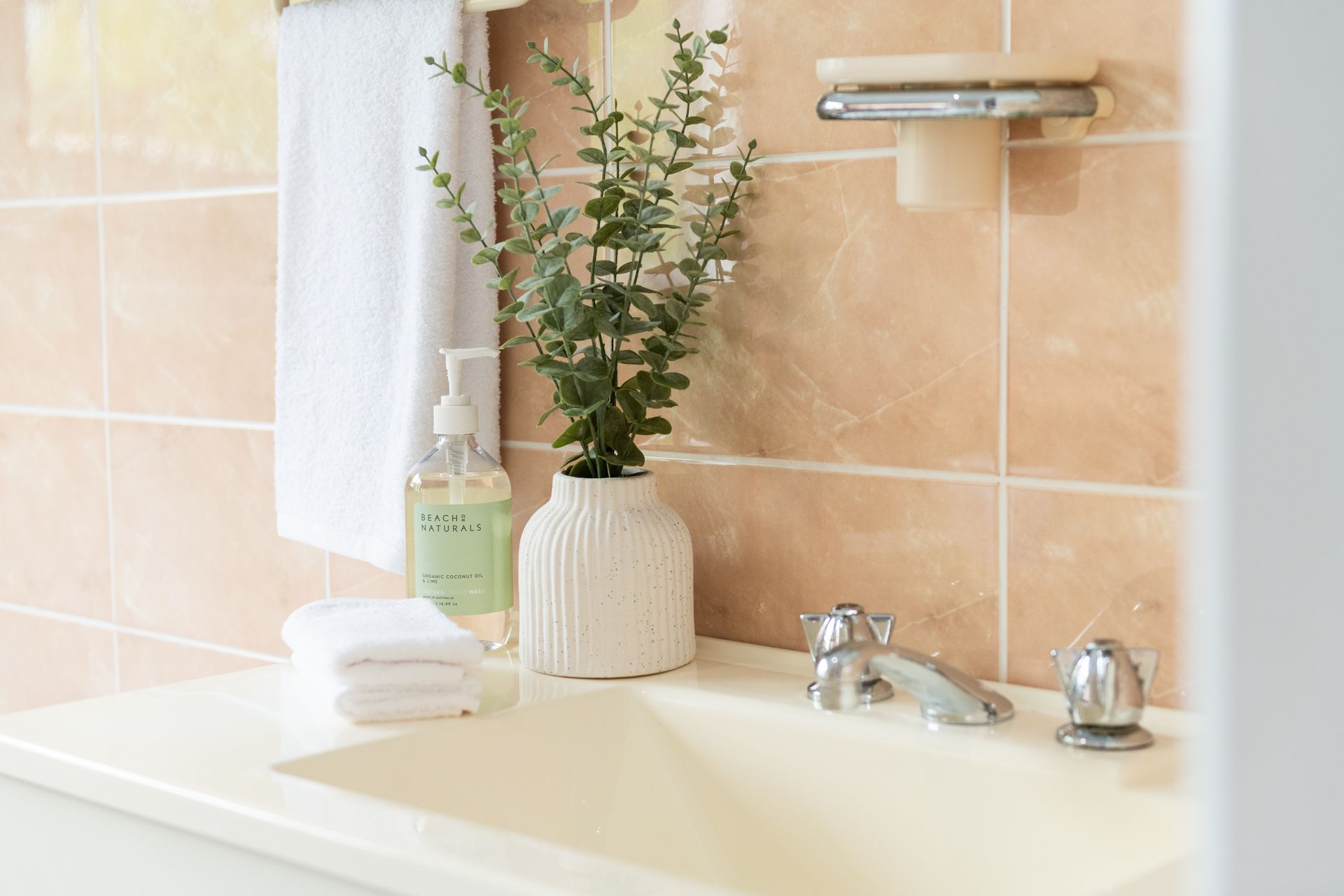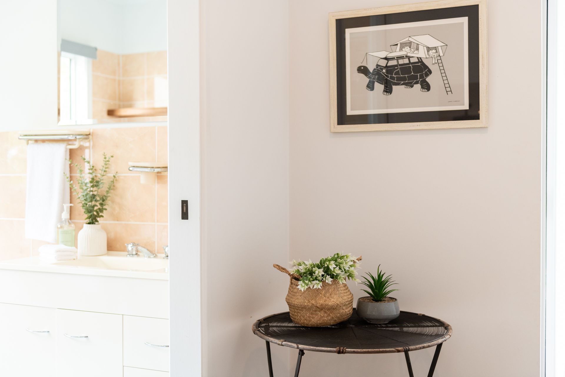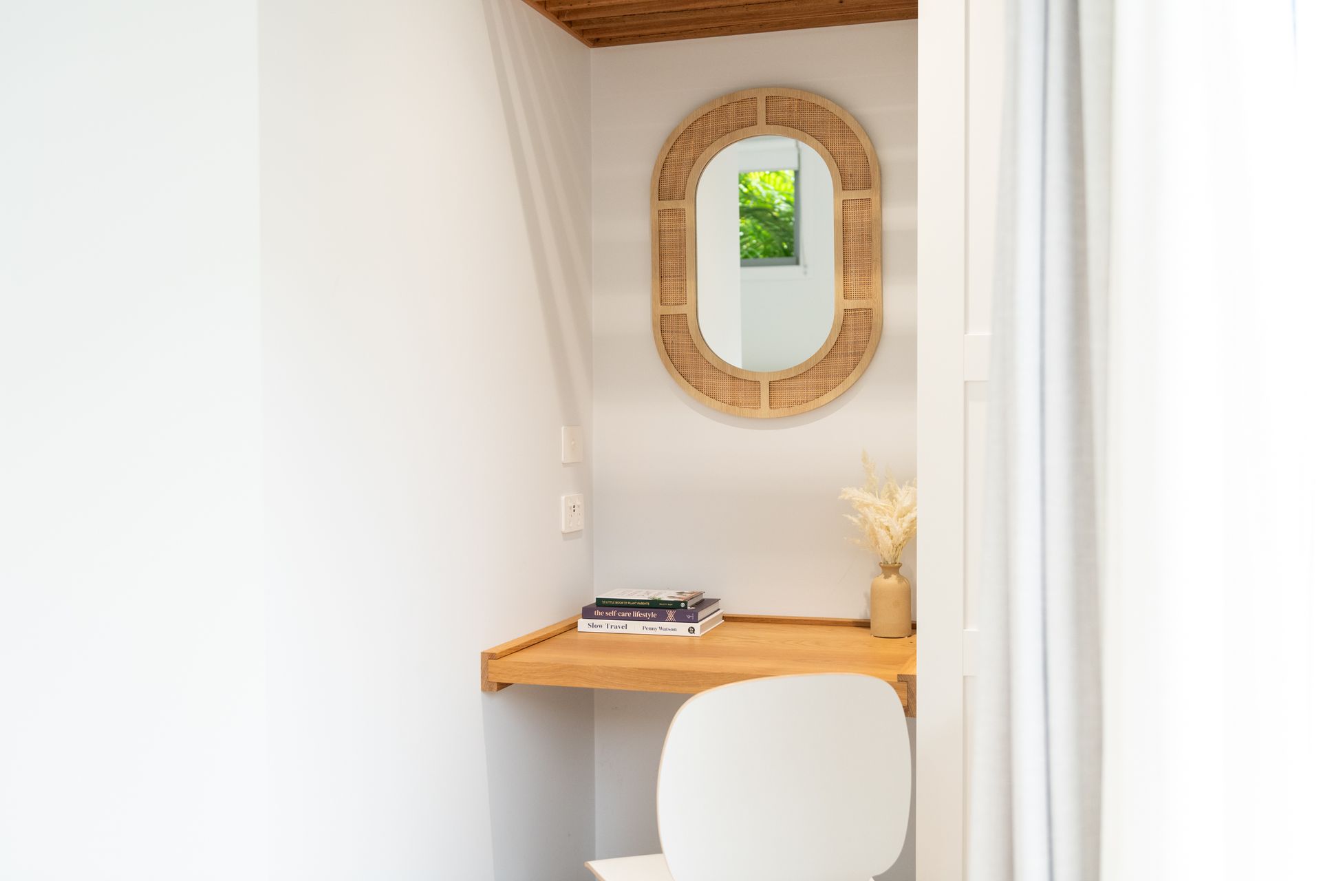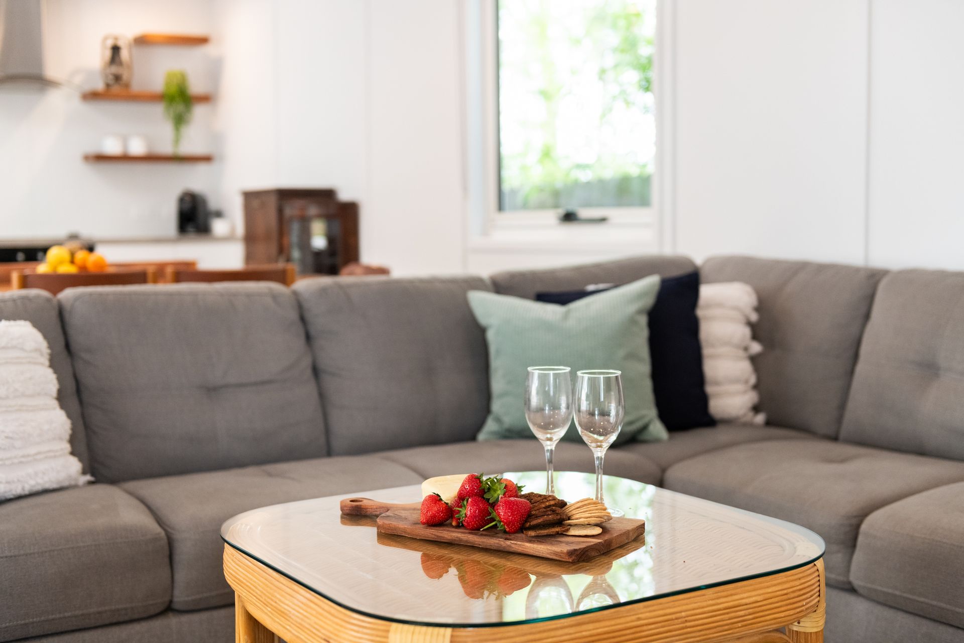 Step inside the main house, where natural light, calming tones and stylish furnishings create an inviting ambience throughout. Two spacious bedrooms, each with a queen bed, offer peaceful places to rest, complemented by a tidy main bathroom and well-equipped kitchen with everything you need to feel at home – including a dishwasher, oven, stove, and Lavazza A Modo Mio coffee machine. A dedicated workspace is also available for those needing to check in during their stay.